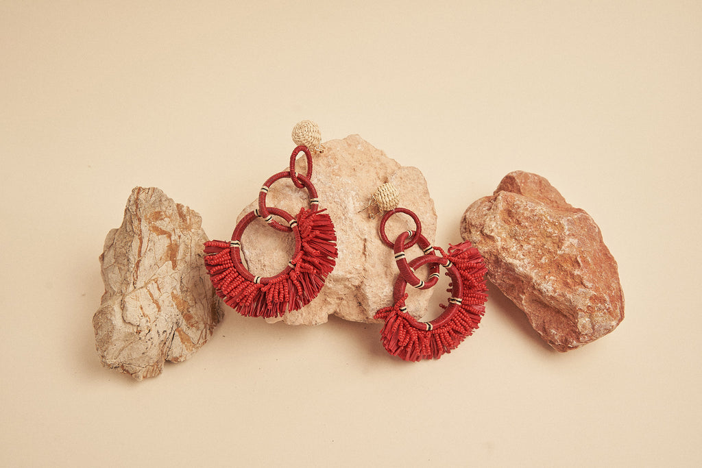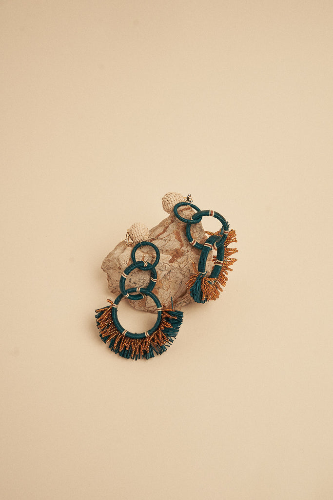 Piezas elaboradas completamente de forma artesanal, compuestas por fibras naturales, cuentas de vidrio, herrajes en bronce y posteriormente bañados en oro de 24K.